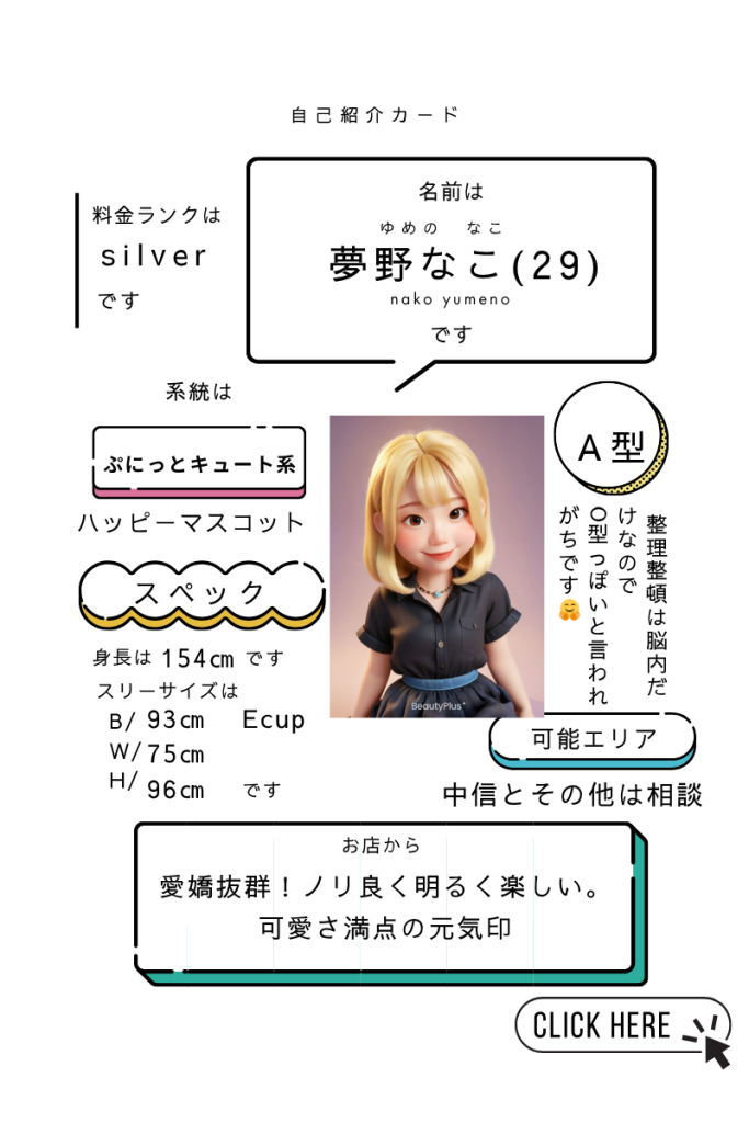 扉を開けた瞬間、パッと花が咲いたような笑顔で迎えてくれるなこさん。 可愛いお顔はもちろん、耳に心地よく響く可愛い声に、一瞬で心を掴まれるお客様が続出中!愛嬌抜群で、とにかく親しみやすくてノリが良いので、まるでお互い一目惚れしたような楽しい時間がすぐに始まります。